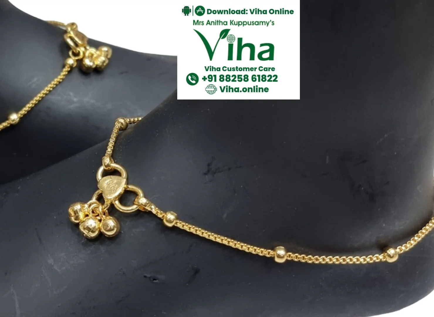 Step into elegance with the Impon Payal from Viha, a beautifully crafted traditional ankle bracelet designed to enhance grace and style. Made from high-quality gold-polished Impon alloy, it offers the rich look of real gold while remaining lightweight and comfortable. Adorned with intricate detailing and classic charms, this payal from Viha is perfect for weddings, festivals, classical dance performances, or daily traditional wear. Durable and stylish, it adds a charming, musical touch to every step, reflecting the trusted quality offered by Viha.